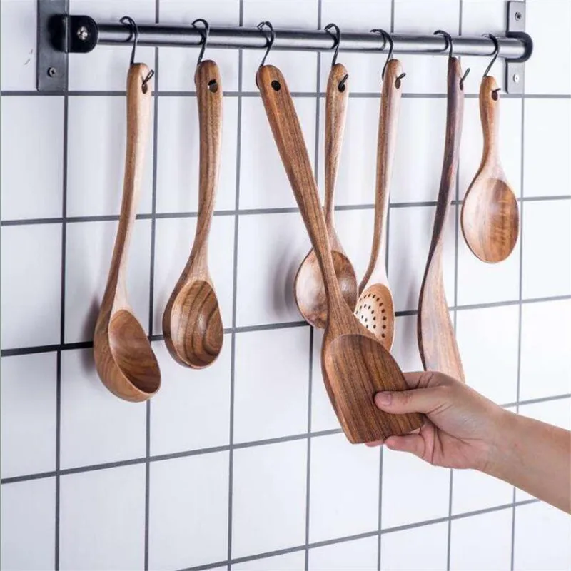 1Pc Teak Natural Wood Tableware Spoon Ladle Turner Rice Colander Soup Skimmer Cook Spoon Reusable Tool Kitchen Cutlery Set