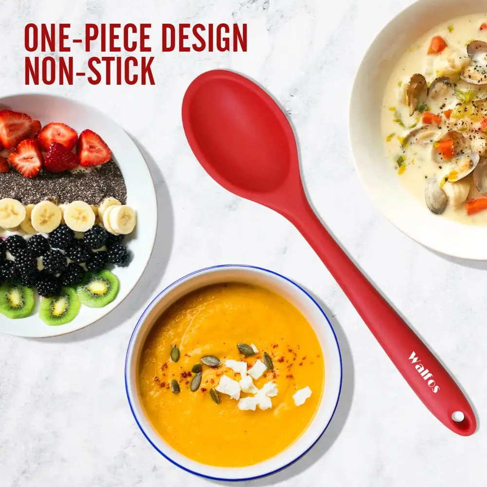 WALFOS Large Food Grade Silicone Long-Handle Soup Spoon Solid Color Baking Kitchen Silicone Spoon Flatware Utensils Accessories