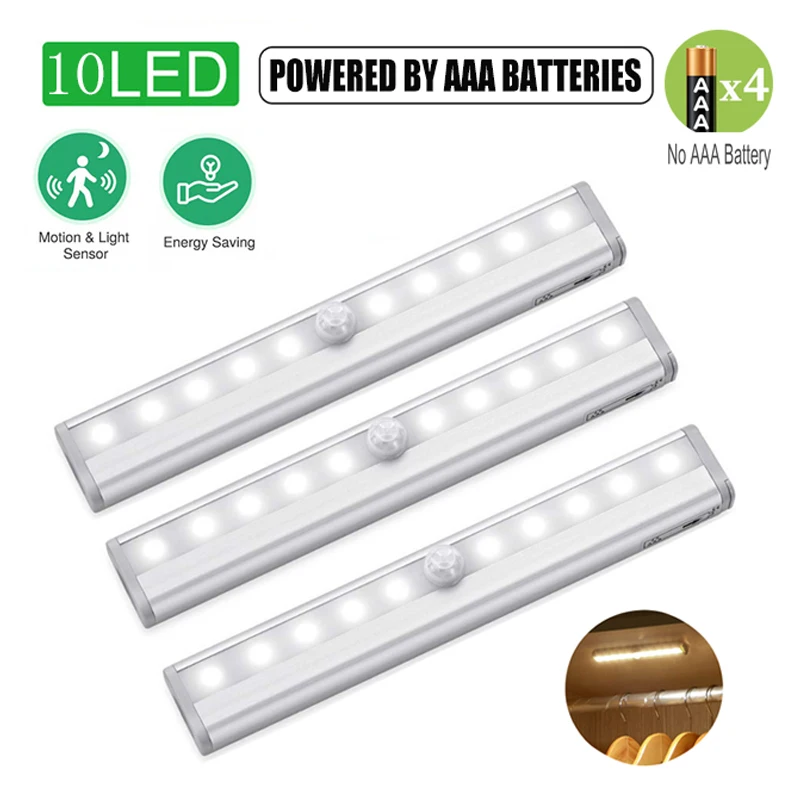 10 LEDs PIR Motion Sensor Closet Light Battery Operated Under Cabinet Lights Cupboard Wardrobe Stairs Wall Lamp For Kitchen Room