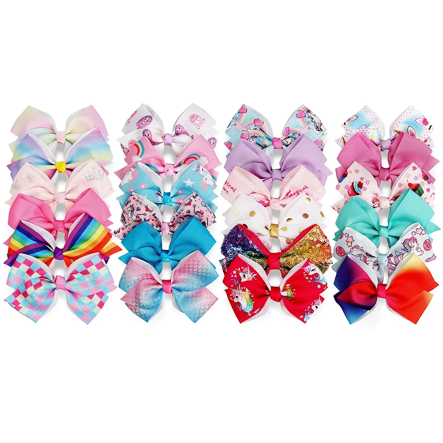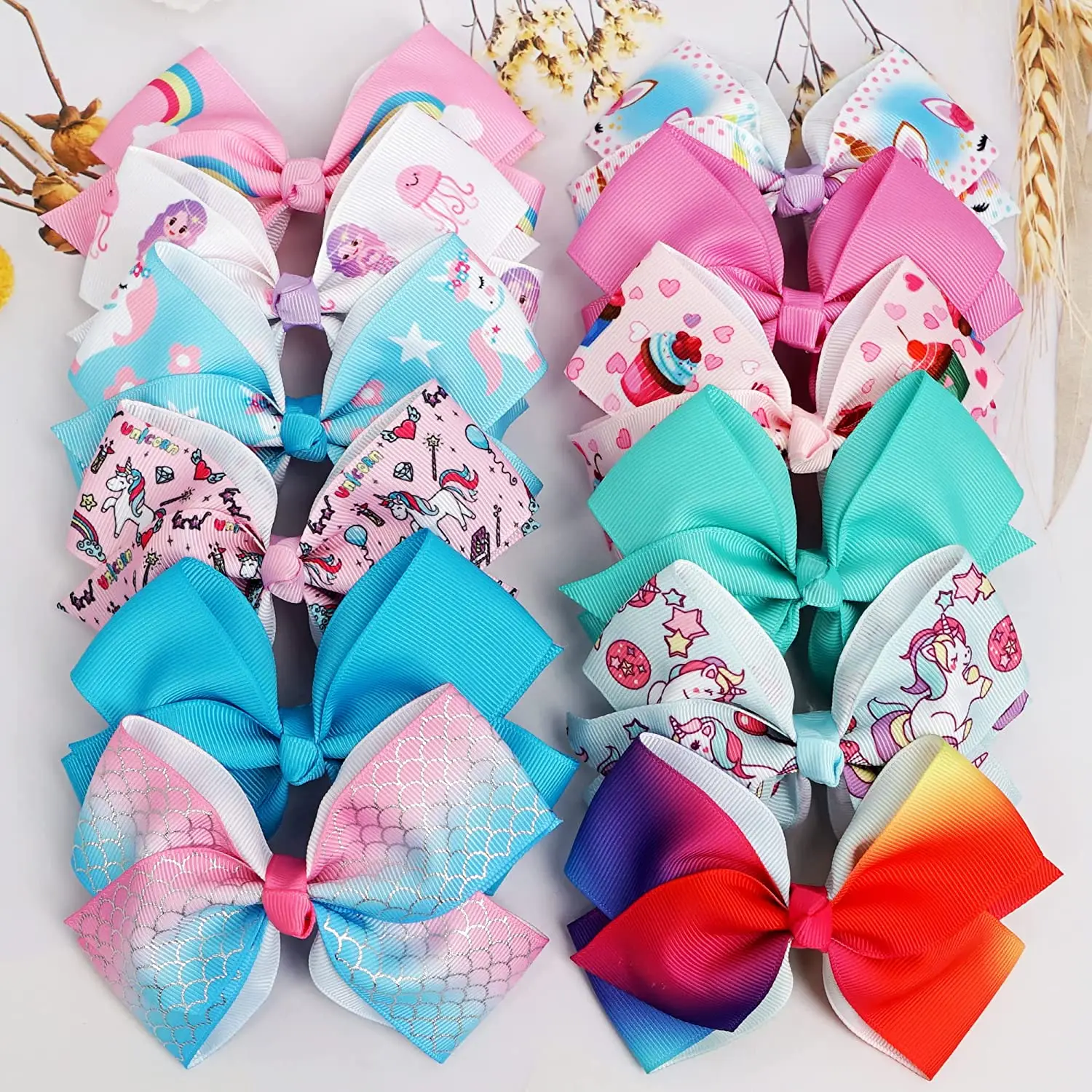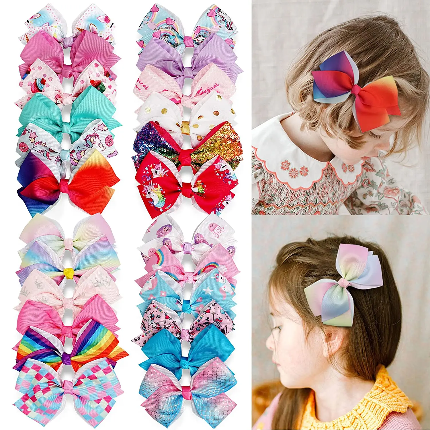 24 Pcs 5 Inches Hair Bows for Girls,Boutique Grosgrain Ribbon Rainbow and Unicorn Bow with Clips Hair Barrettes Accessories for