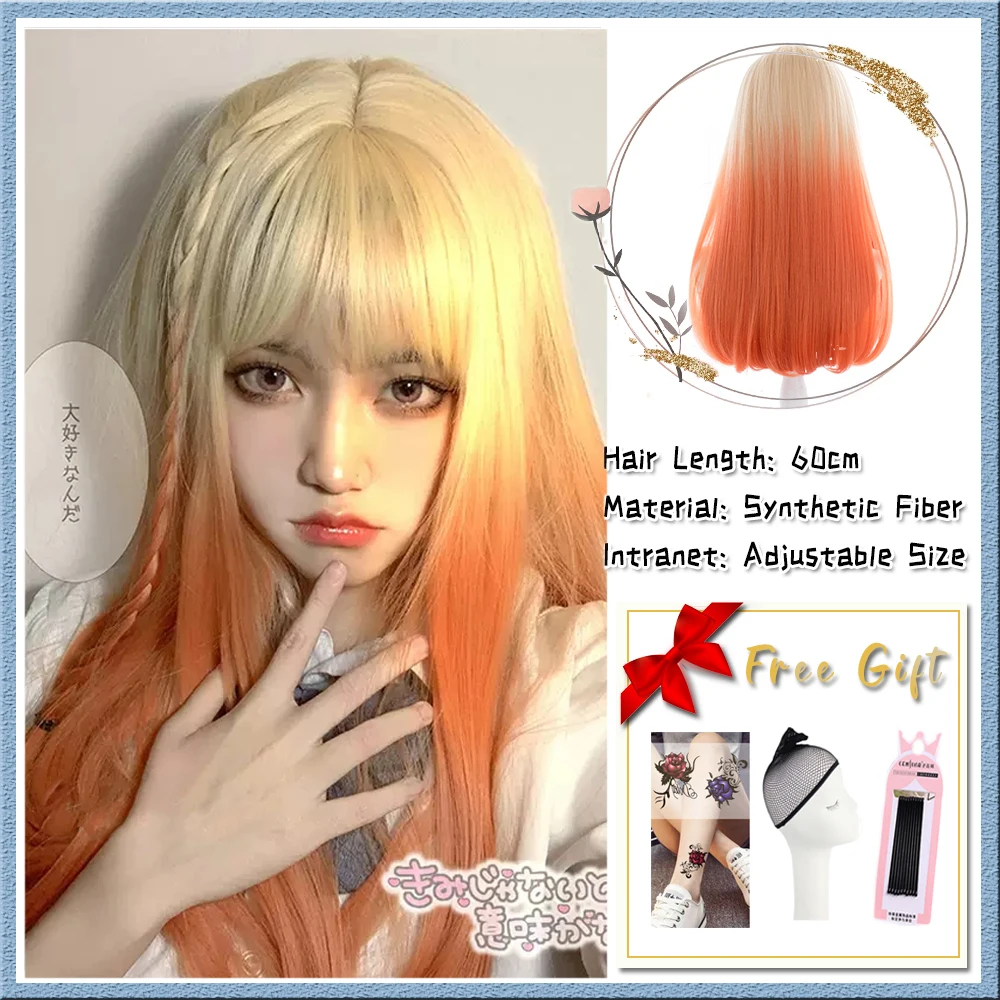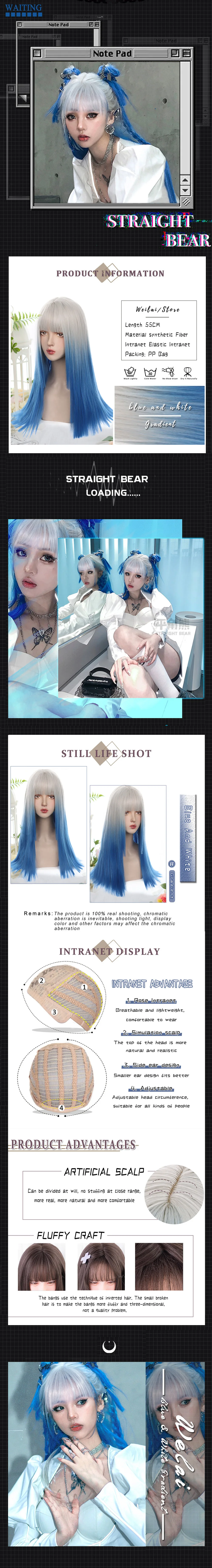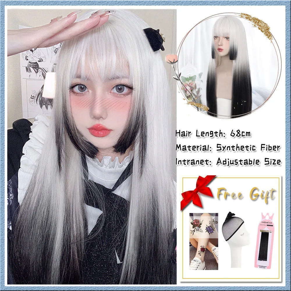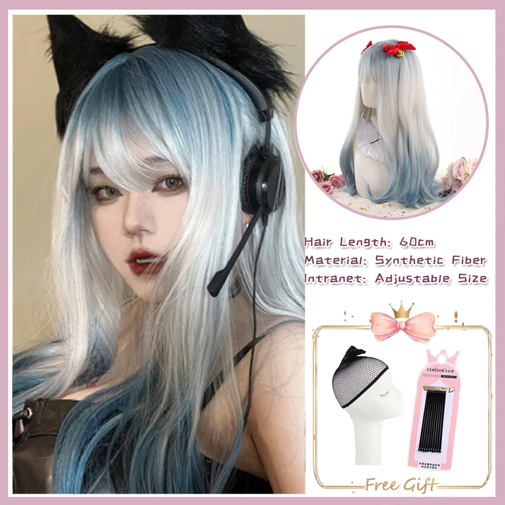 US $10.62 Blue And White Gradient Lolita Long Straight Hair With Bangs Synthetic Wig Women's JK Natural Heat-Resistant Wig