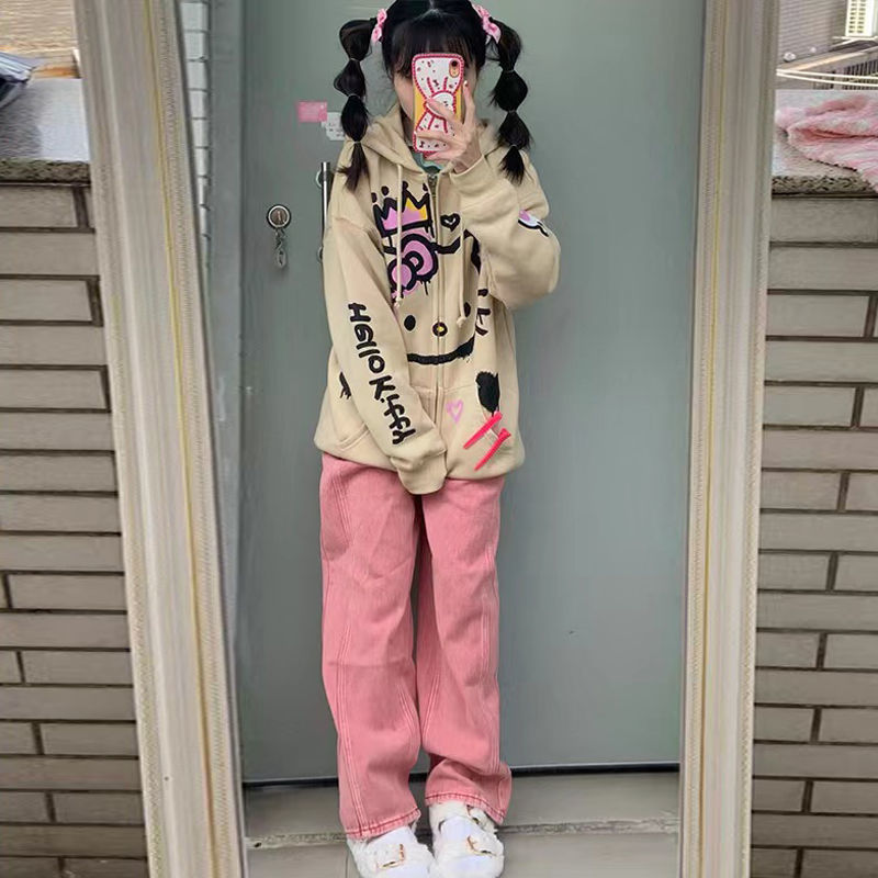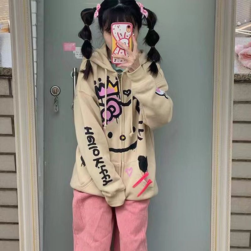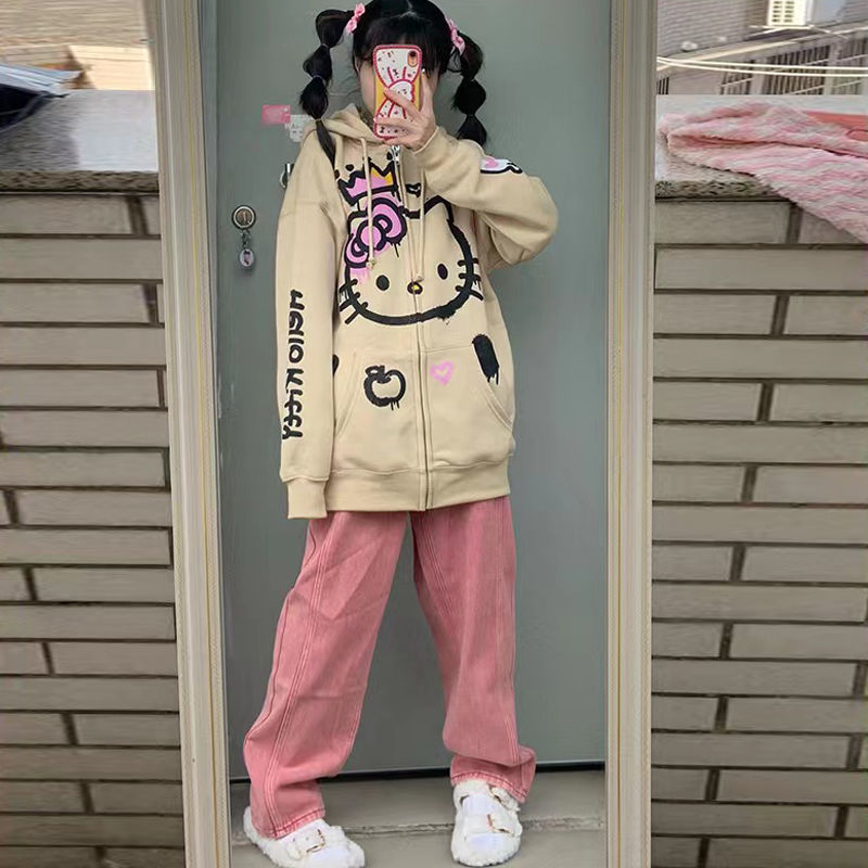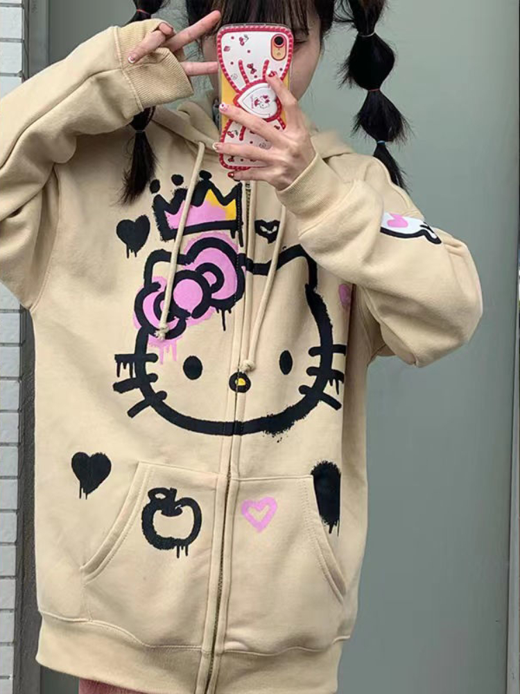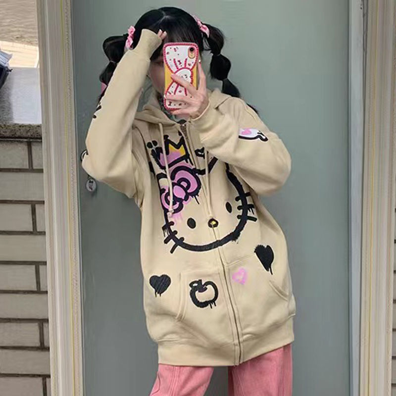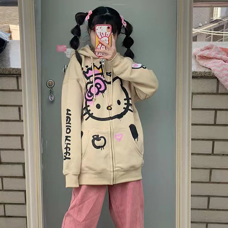 US $18.82 Sanrio Cartoon Print Hello Kitty Beige Hooded Sweater Loose 2022 Women's Autumn Fashion Thick Cute Hoodie Coat