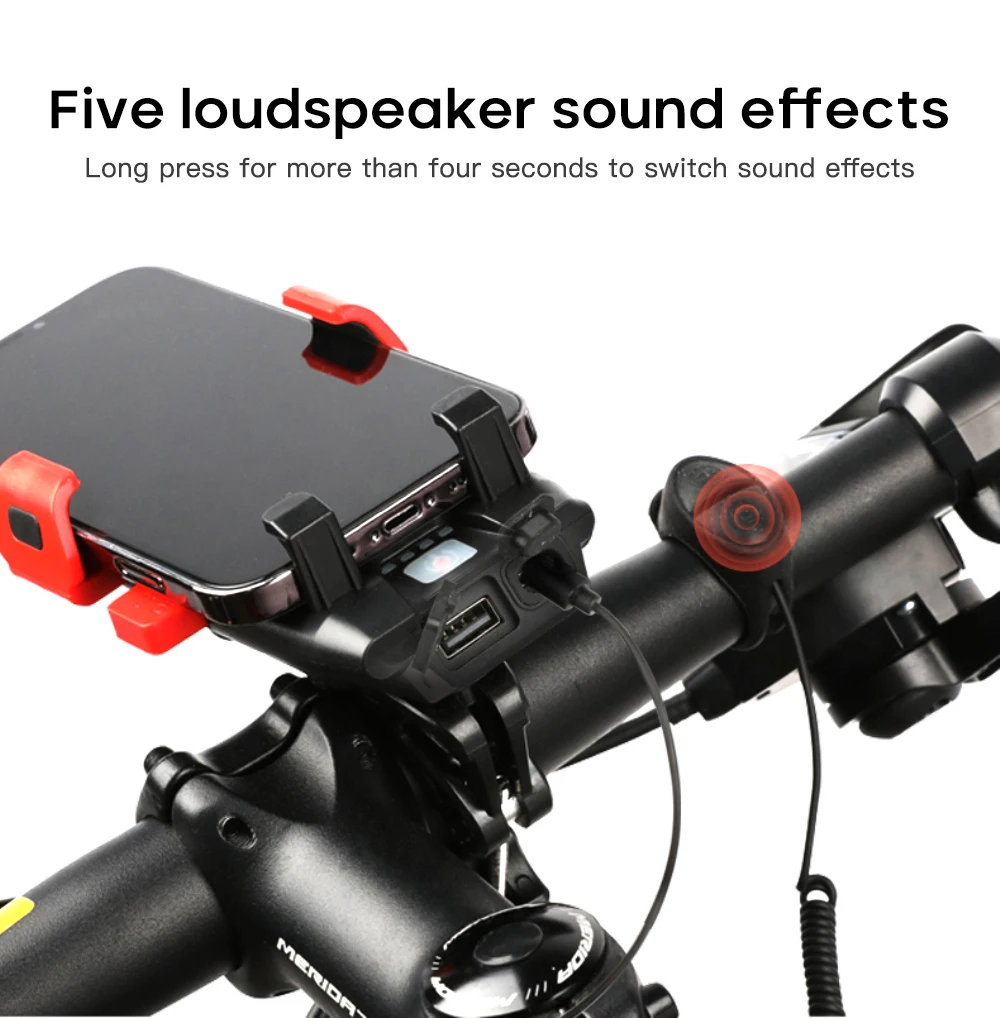 Bicycle multi-functional headlight, which integrates horn, flashlight, mobile phone bracket and charging treasure.