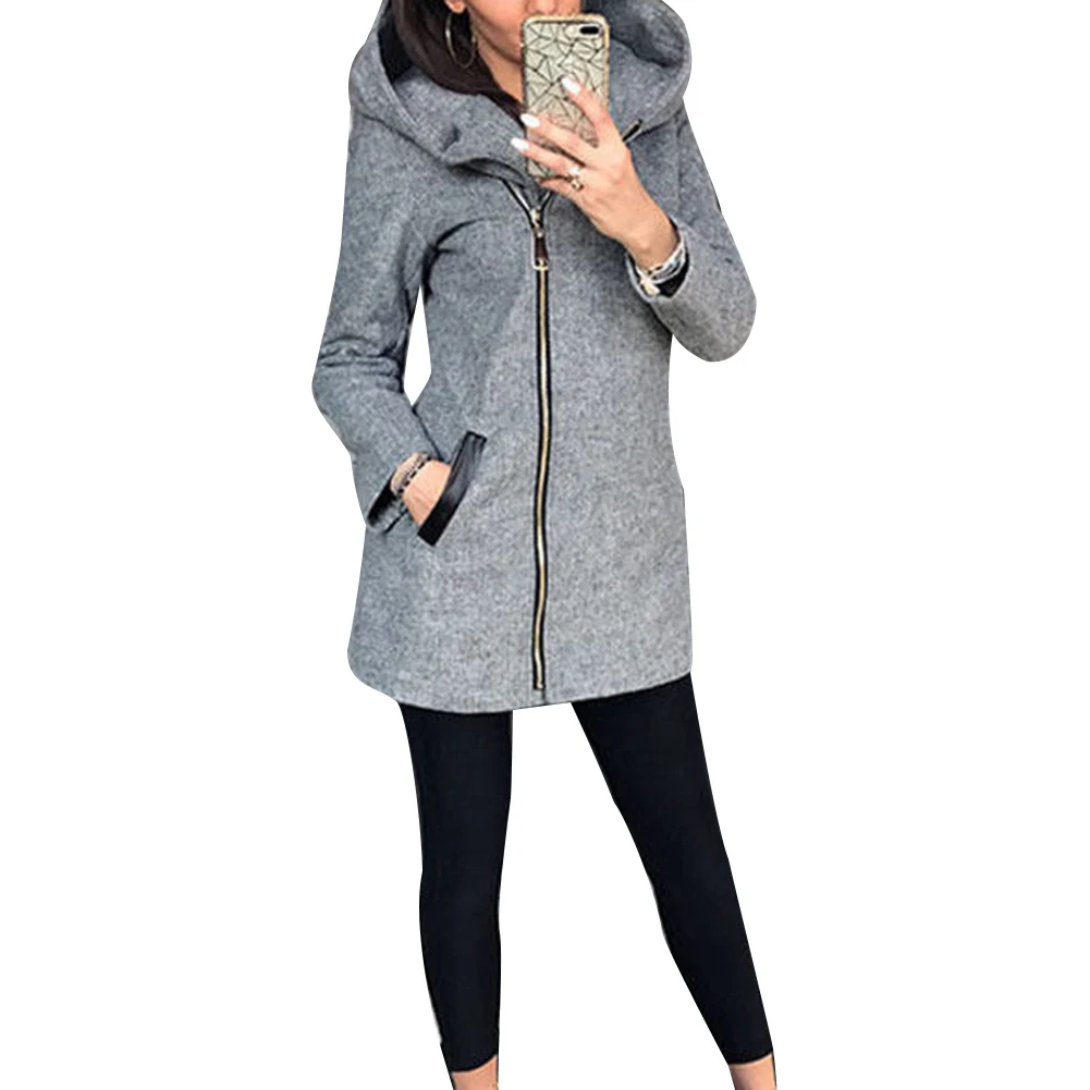 Women Fashion Solid Color Thicken Wadded Hooded Coat Zipper Midi Jacket Outwear