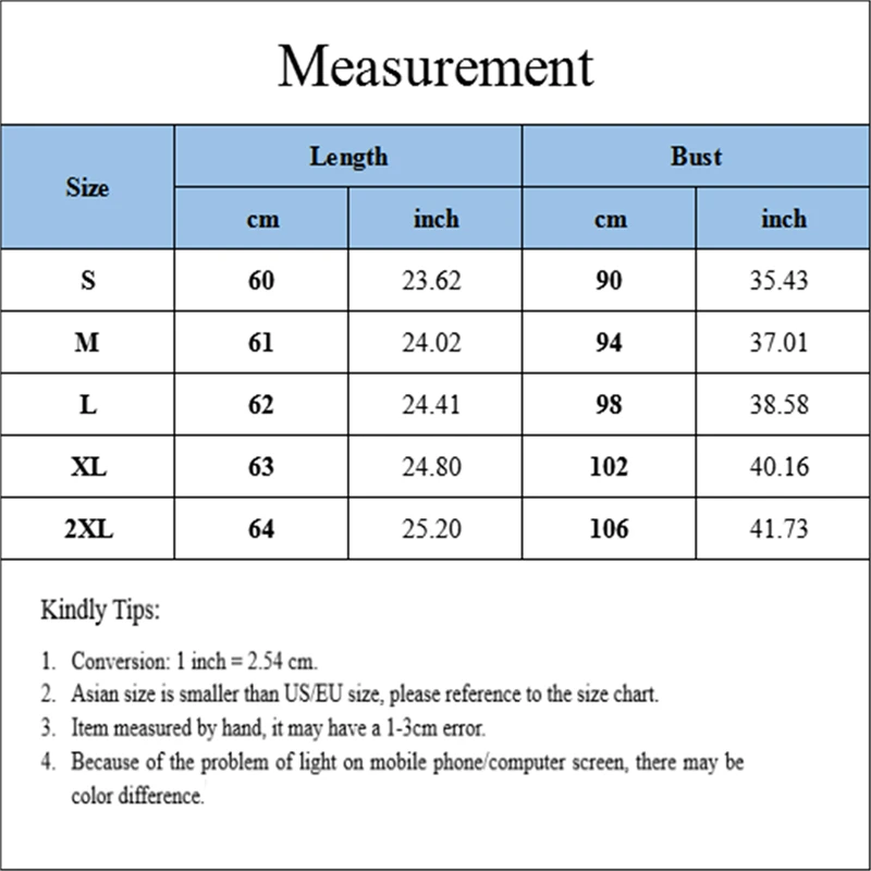 Size Length/cm Bust/cm S 60 90 M 61 94 L 62 98 XL 63 102 2XL 64 106Kindly Tip : 1. Please be reminded that due lighting effects, monitor's brightness/contrast settings etc, there could be some slight differences in the colour tone of the website's photo and the actual item. 2. Item Measure by hand, it could be 1-3cm different, your kind understanding will be much appreciated