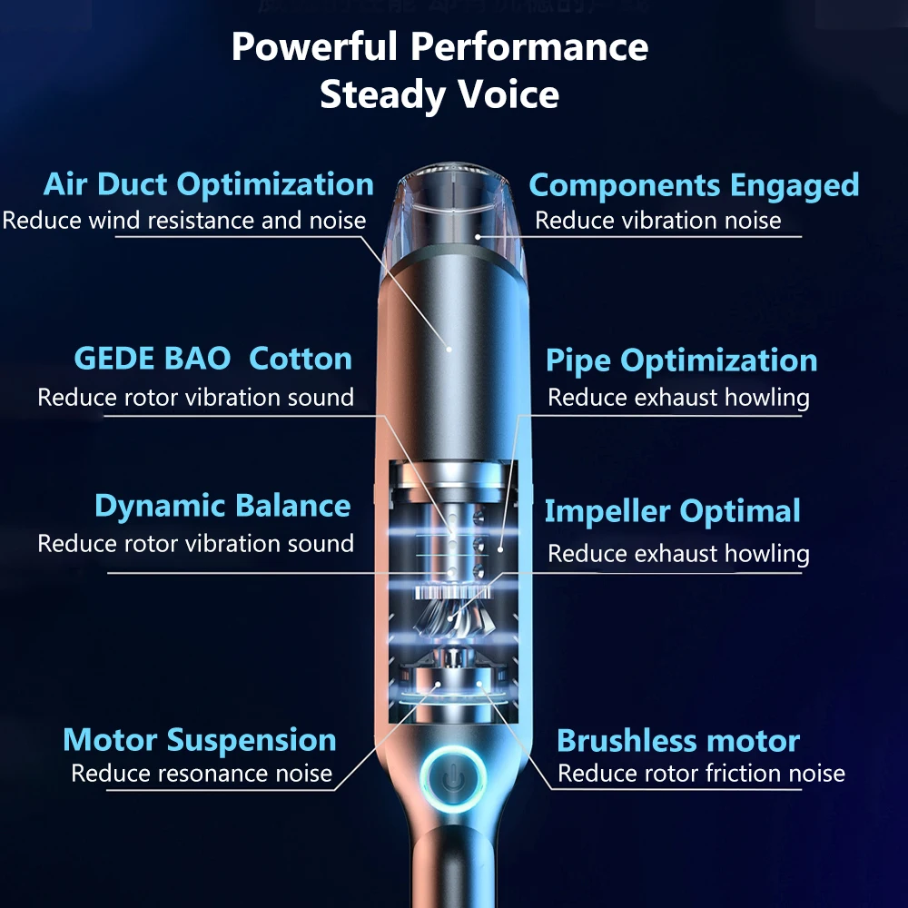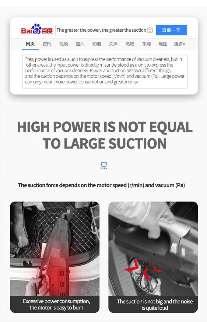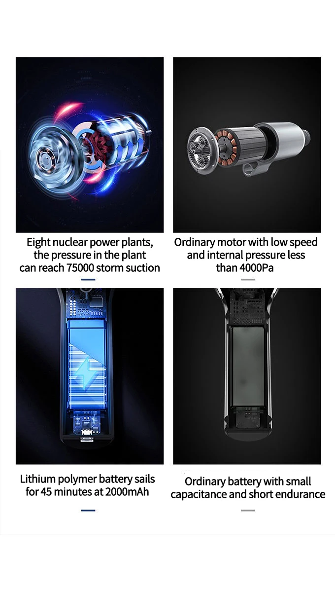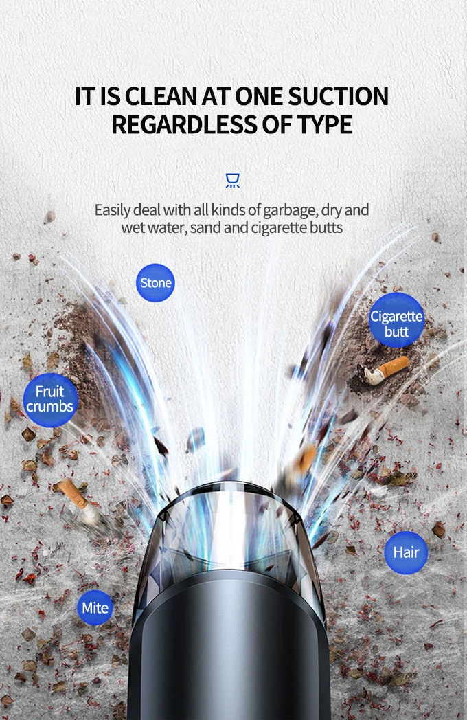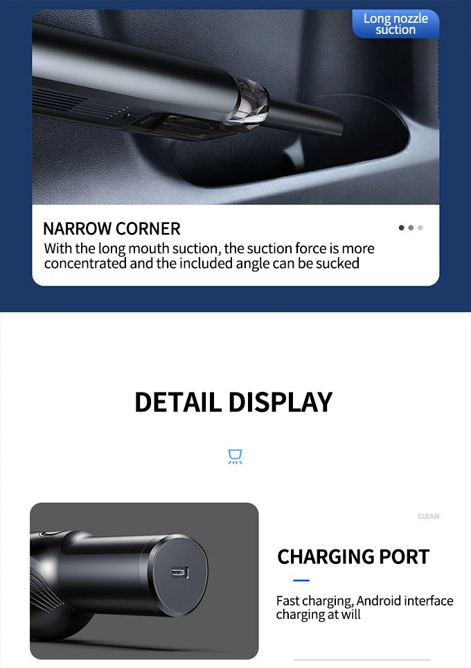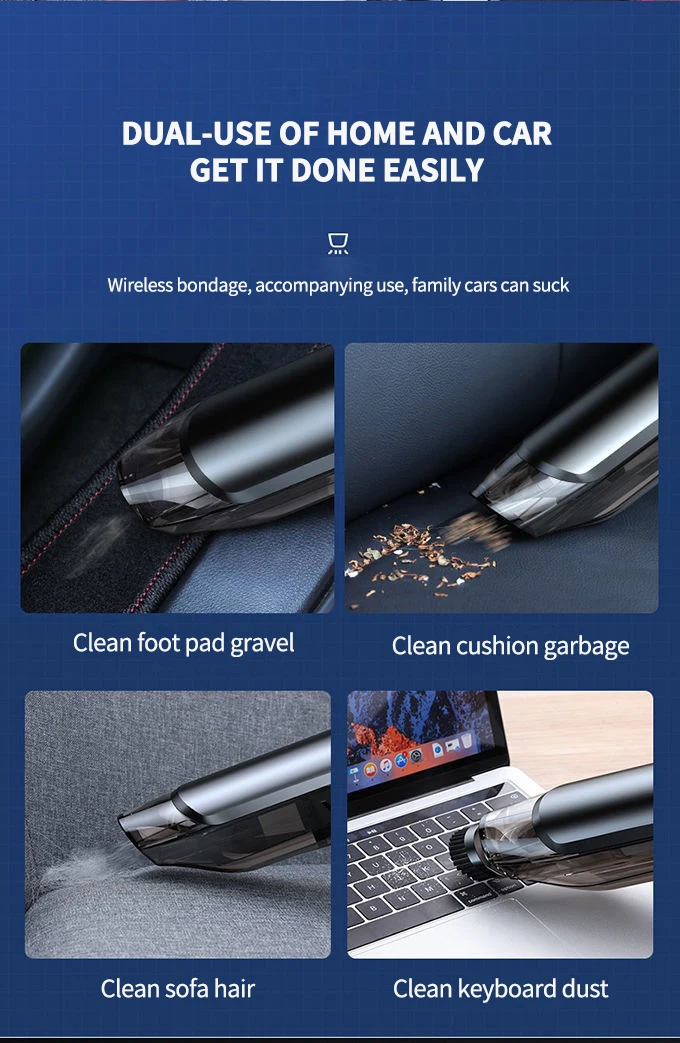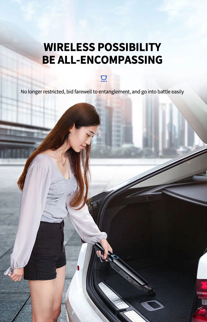 Long-lasting battery life can easily clean up the hygiene in the home car. Dual-core frequency conversion chip can easily handle the cleaning in the car and at home, reasonably release the current under the monitoring and adjustment of intelligent power supply management system, and cooperate with air cooling system to ensure the continuous and excellent operation of battery pack, which can complete the cleaning of a larger area at one time.
