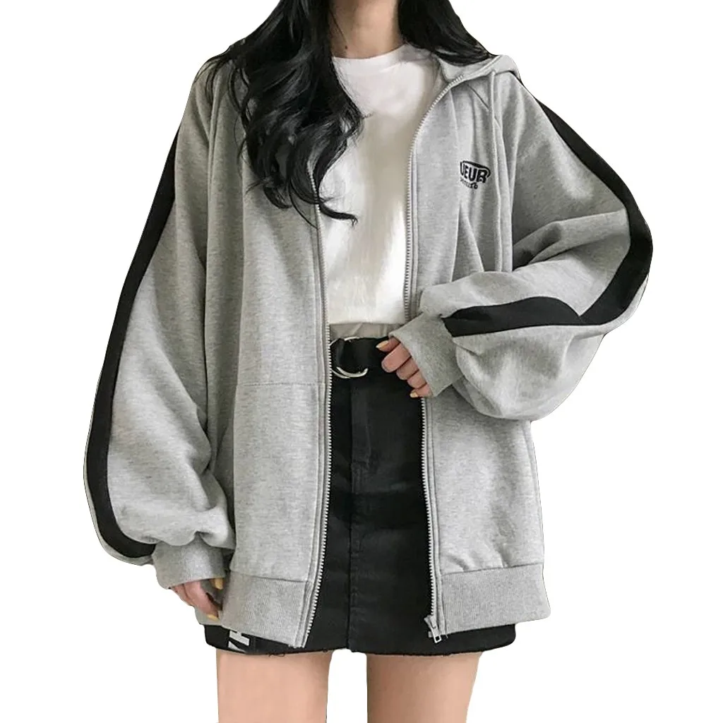 Fashion Women Cardigan Splicing Hooded Top Long Sleeve Blouse Loose Coat