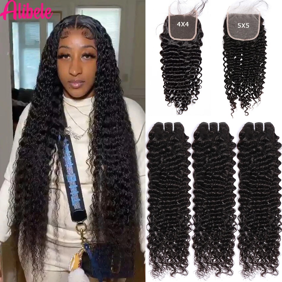 US $77.49 5x5 HD Lace Closure With Bundles Deep Wave Hair Bundles With Closure Brazilian Curly Hair With 4x4 5x5 Transparent Lace Closure